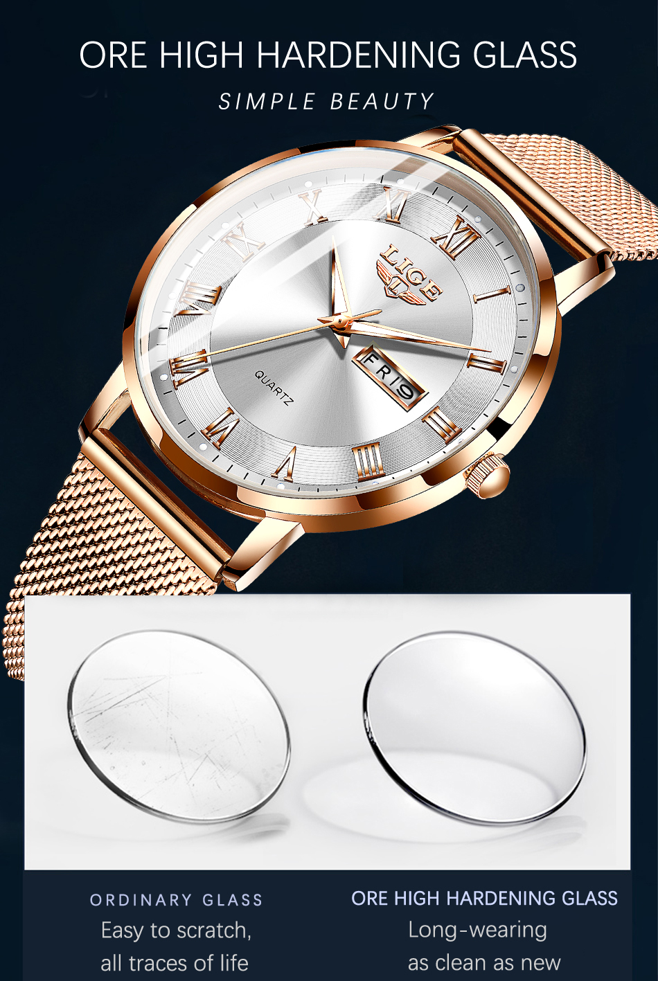 Le boîtier et le bracelet en acier inoxydable offrent une bonne résistance à l’usure et à la corrosion. Le cadran rond est mis en valeur par un boîtier en alliage de zinc à la finition brillante.