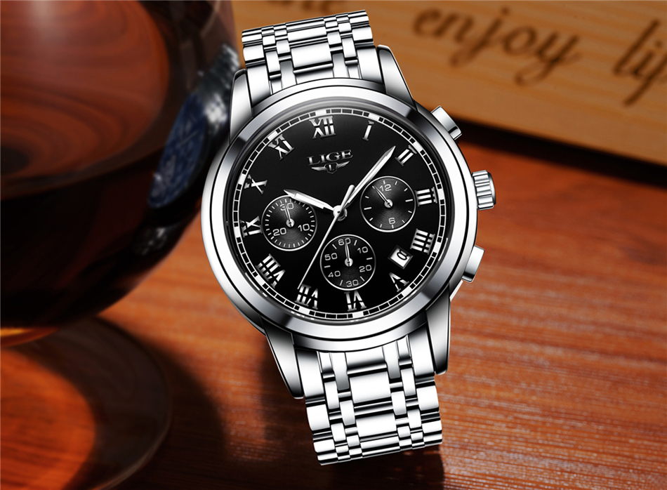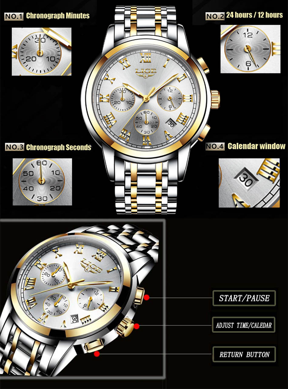 Profitez d’un chronographe précis pour mesurer le temps avec fiabilité, ainsi qu’un affichage 24h et une fenêtre calendrier intégrée. Les boutons permettent de démarrer, mettre en pause et réinitialiser les fonctions facilement.