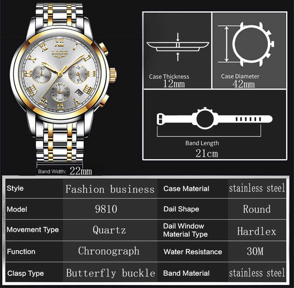 Le boîtier en acier inoxydable de 42 mm et le verre Hardlex offrent robustesse et élégance. Le bracelet de 22 mm assure un maintien confortable, tandis que le mouvement quartz garantit une grande précision.