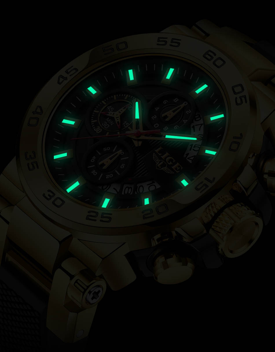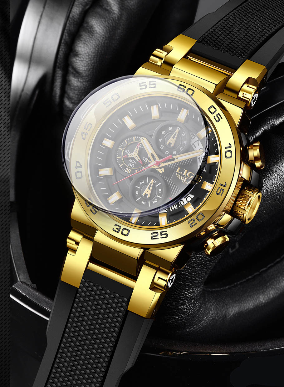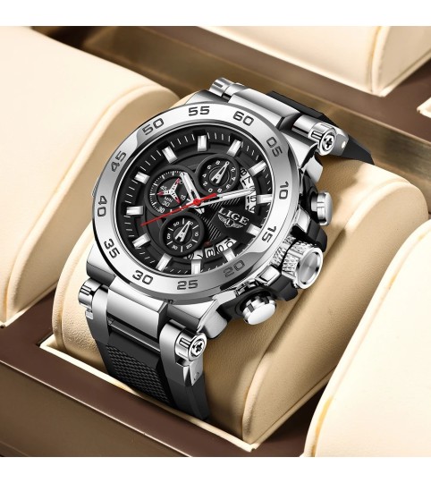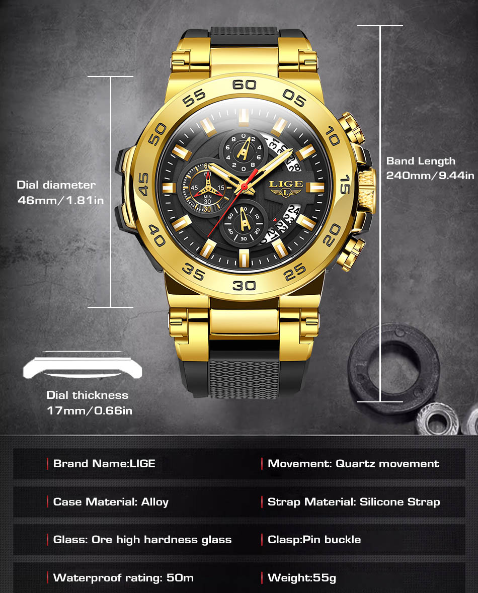 Le boîtier de 46 mm offre une présence marquée au poignet, tandis que le verre renforcé assure une excellente résistance aux chocs. Le bracelet en silicone et la boucle ardillon garantissent un maintien fiable et un confort durable, même lors d’un usage quotidien.
