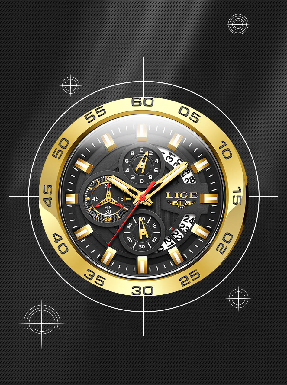 Le cadran intègre trois sous-cadrans et six aiguilles pour une lecture rapide et intuitive des différentes fonctions. Les éléments du cadran sont conçus pour offrir une visibilité optimale à tout moment.